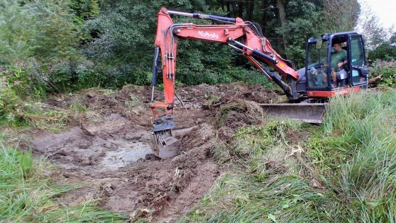 Vor über 30 Jahren haben wir zusammen mit dem BUND im Beidenauer Grund bei der Roten Mühle einen Tumpel gegraben, der inzwischen fast verlandet ist. Um dieses Amphibien-Habitat auch für die nächsten 15 oder 20 Jahre zu erhalten, wurde nun mit Unterstützung der Naturschutzbehörde direkt nebenan ein neuer Teich ausgebaggert.