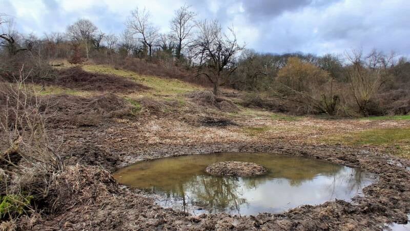 März ist der Wonnemonat für Grasfrösche und Erdkröten. Rechtzeitig vor Beginn der Laichzeit konnten wir das Ausbuddeln eines neuen Amphibienteichs im FFH "Wiesen im Süßen Gründchen bei Neuenhain " abschließen.