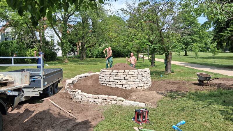 3. Juni 2025: Die Schmetterlingsspirale ist errichtet. Jetzt fehlt nur noch die Bepflanzung mit Wildstauden.
