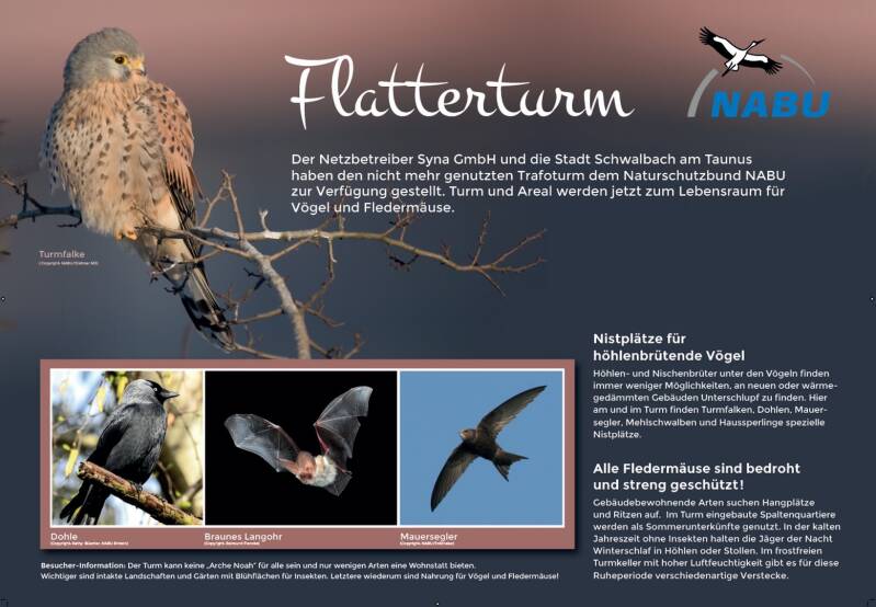 Der Kreisverband NABU Main-Taunus hat einen nicht mehr genutzten Trafoturm von der Gemeinde Schwalbach gepachtet. Der Umbau des Trafoturms zu einem Refugium für Fledermäuse und Vögel erfolgt in Regie des NABU Bad Soden.
